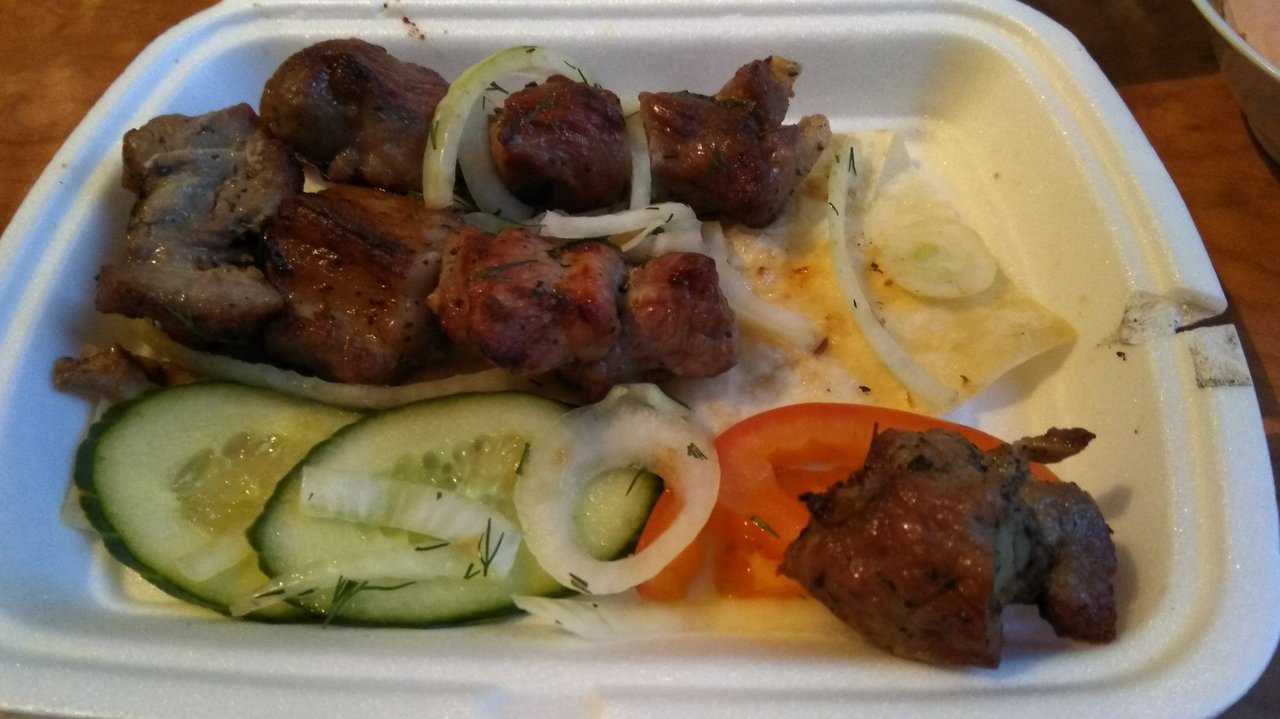 Не берите в данном заведение. Это ужас. Шаурма вся женная. Картошка сырая. Шашлык сухой. Шашлык от заявленного веса существенно отличается. Взвесил разнила 60 грамм составила. То есть их заявленный готовый вес и сколька было в заказе отличается на 60 грамм.